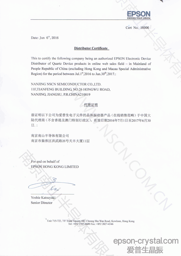 愛普生公司為南京南山半導體有限公司2016年度新頒發(fā)的授權代理證書編號與2015版略有不同,由15006變更為16006,望周知。