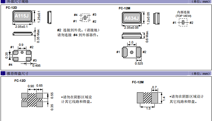 可以看出,FC12M與FC12D相比,FC12D比FC12M更薄,除了體積,我們可以看出FC-12D是兩腳貼片晶振,而FC-12M是四腳晶振,所以這兩者是否可以通用,也要看自身電路焊點是否可以通用,因為小尺寸,超薄的特點,所以FC-12D與FC-12M通常用在消費類產品如信用卡等產品中。